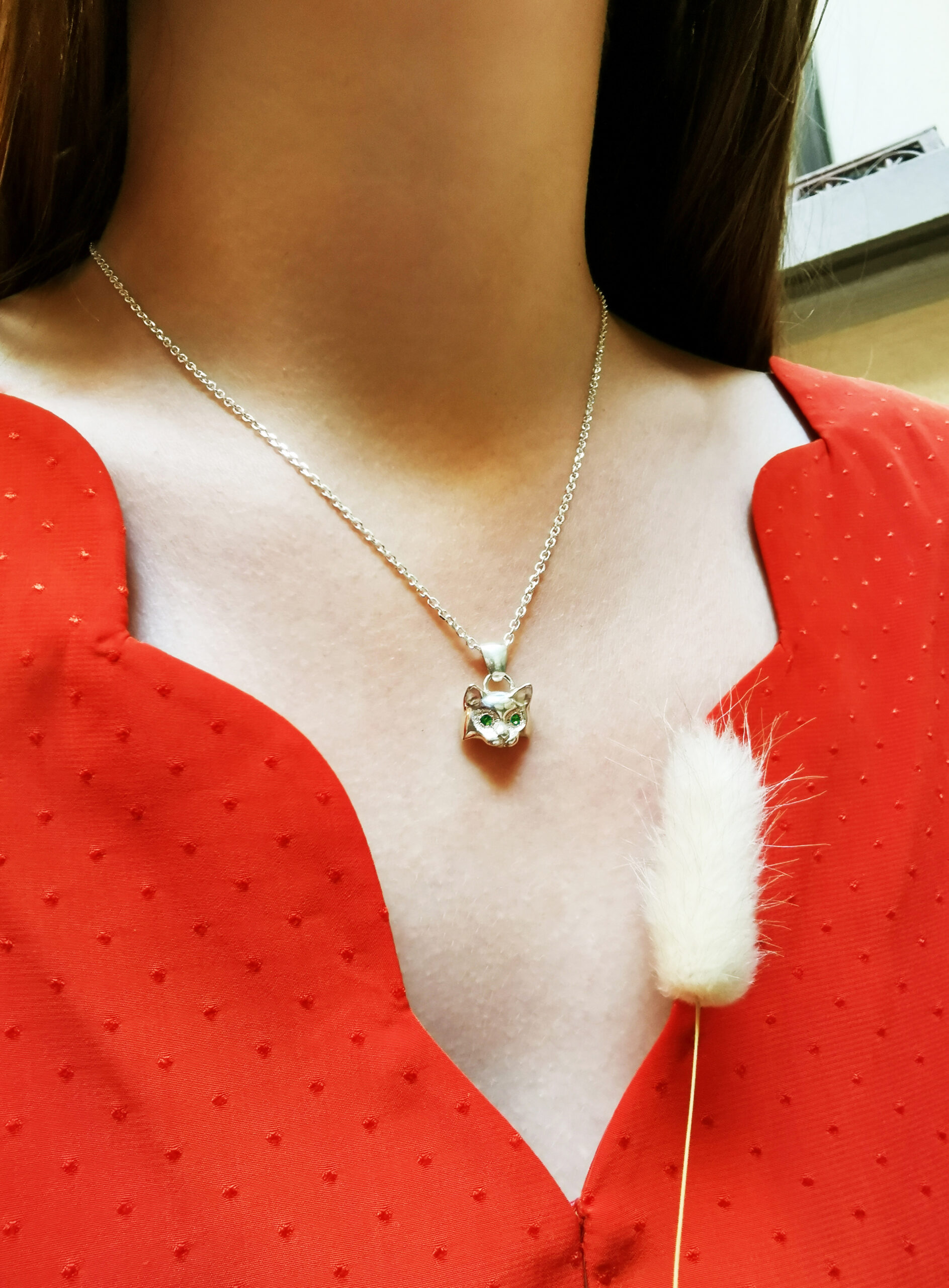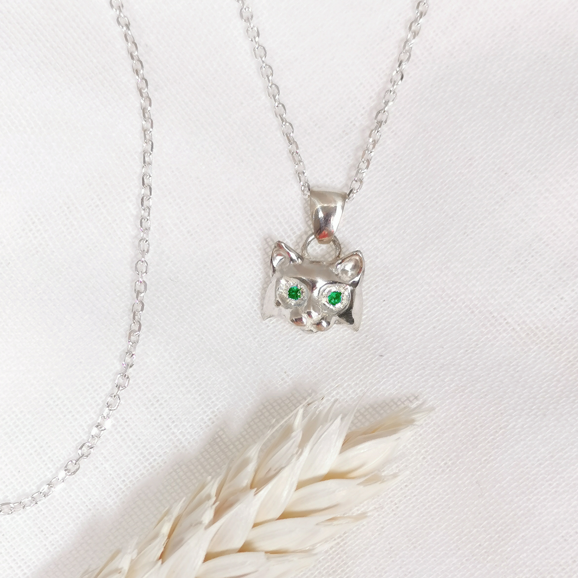 Ce pendentif représente une tête de chat en argent, les yeux sertis de deux grenats verts tsavorites. Je me suis inspirée d’un Maine Coon pour la physionomie. C’est un bijou artisanal fait main, fabriqué en France dans mon atelier à Paris.